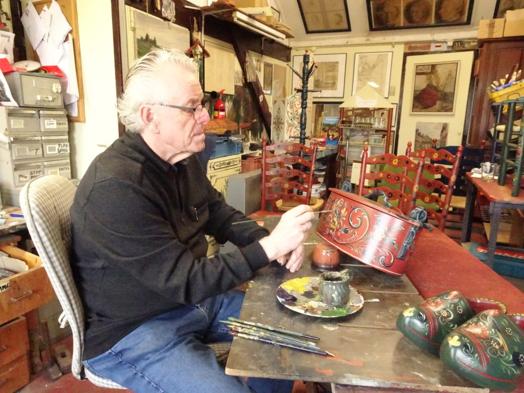 After 17 years he decided to start his own business.Together with his wife he started a small antique shop where the Hindeloper painting was also sold.For many years, Bootsma’s shop and studio has been located at the current location, Kleine Weide 1-3 in Hindeloopen. An old building that also houses The First Frisian Ice Skate Museum and a Pancake House. It is a real family business. “My wife does the shop, my daughters the catering and together with my son Pieter I do the Hindelooper painting and the museum,” says the master painter. Pieter, too, turned out to have drawing talent and, just like his father, he joined Hindelooper painter at the age of seventeen.17年後、彼は自分のビジネスを始めることを決め、妻と一緒に小さなアンティークショップをオープンしました。そこではヒンデロペンの作品も売られました。年月は経ち、Bootsmaのショップとスタジオは現在、Kleine Weide 1-3にあります。 フリス州初の、アイススケート博物館とパンケーキハウスもある古い建物です。家族経営で、 「妻が店を、娘がケータリングを、息子と私がヒンダローペン絵画と博物館を担当します」と、彼は言います。 ピーターも絵を描く才能を持っていることが判明し、父親のように、17歳でヒンダローペンの画家に加わりました。17年后,他决定开办自己的生意,与妻子一起开办了一家小古董店,还出售了Hindeloper的画作。多年以来,Bootsma的商店和工作室一直位于目前的位置Kleine Weide 1-3在欣德洛彭。一幢老建筑,里面还设有弗里斯兰第一滑冰博物馆和煎饼屋。这是一家真正的家族企业。画家大师说:“我的妻子经营商店,我的女儿从事餐饮业,我与儿子彼得一起做欣德洛珀绘画和博物馆。”皮特(Pieter)也有绘画才能,就像他父亲一样,他在十七岁时就加入了欣德洛普尔画家。多年来,Bootsma的商店和工作室一直位于欣德洛彭市的现址Kleine Weide 1-3。一幢老建筑,里面还设有弗里斯兰第一滑冰博物馆和煎饼屋。这是一家真正的家族企业。画家大师说:“我的妻子经营商店,我的女儿从事餐饮业,我与儿子彼得一起做欣德洛珀绘画和博物馆。”彼得也同样具有绘画天分,就像他的父亲一样,他在17岁时加入了Hindelooper画家