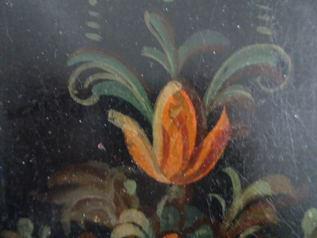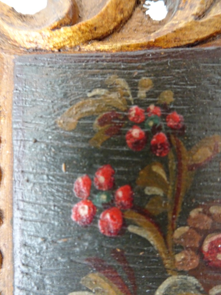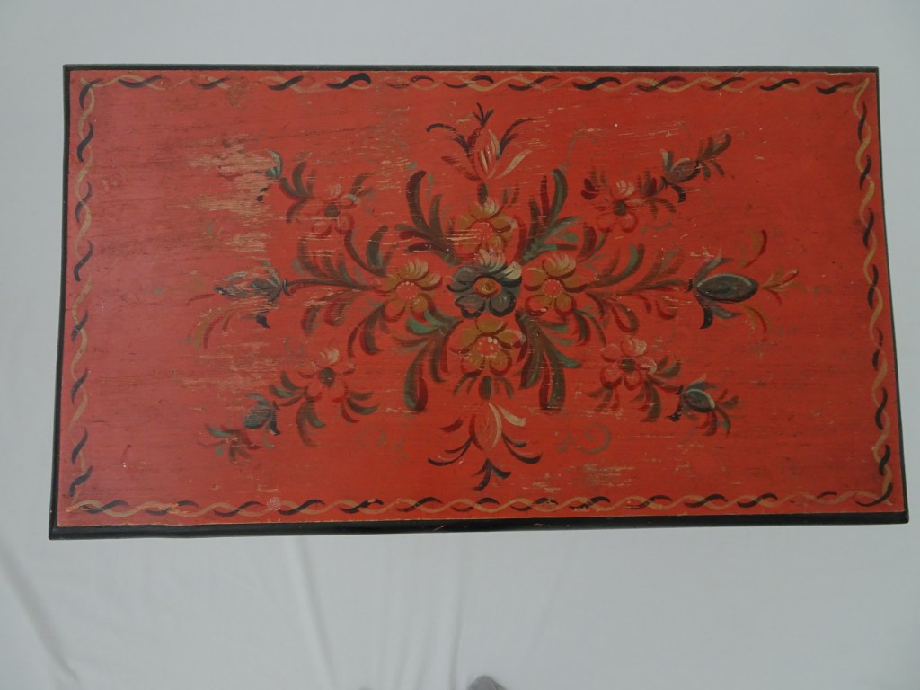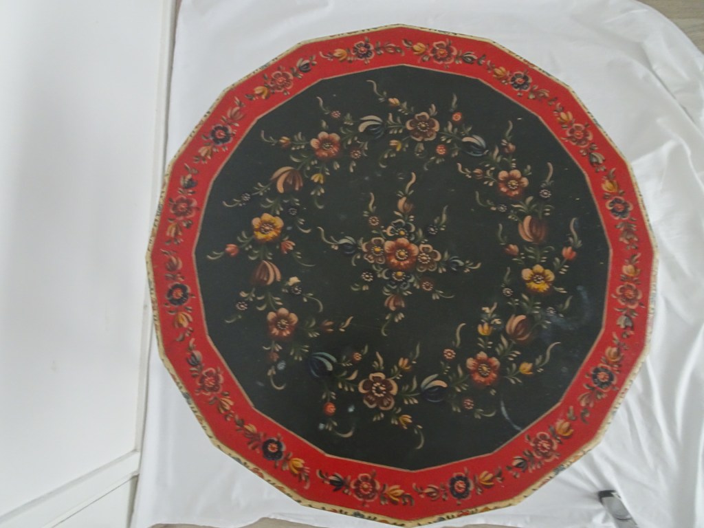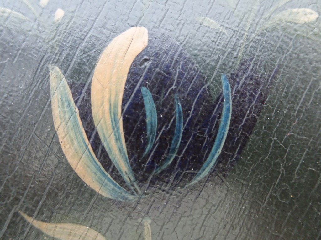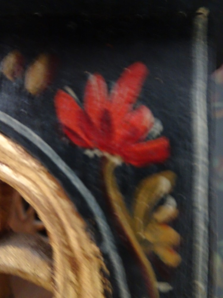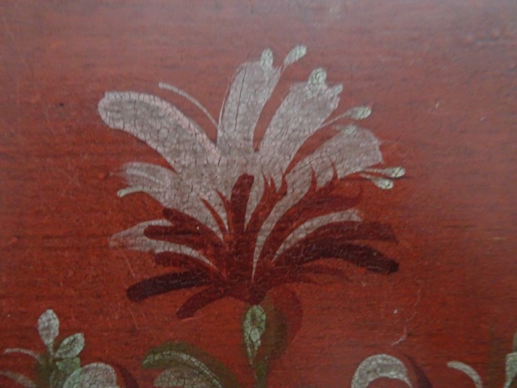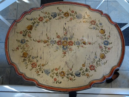 It is a dark blue table. The top plate leans against the wall and shows the red side of the back. There is a sunflower at the end of the scroll, but it was not drawn after that. Birds expelled from paradise find their whereabouts, but look behind them. There is the biblical representation of Genesis 37: verse 28. One flower is drawn on the bulge of the leg called onion.