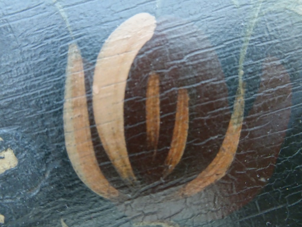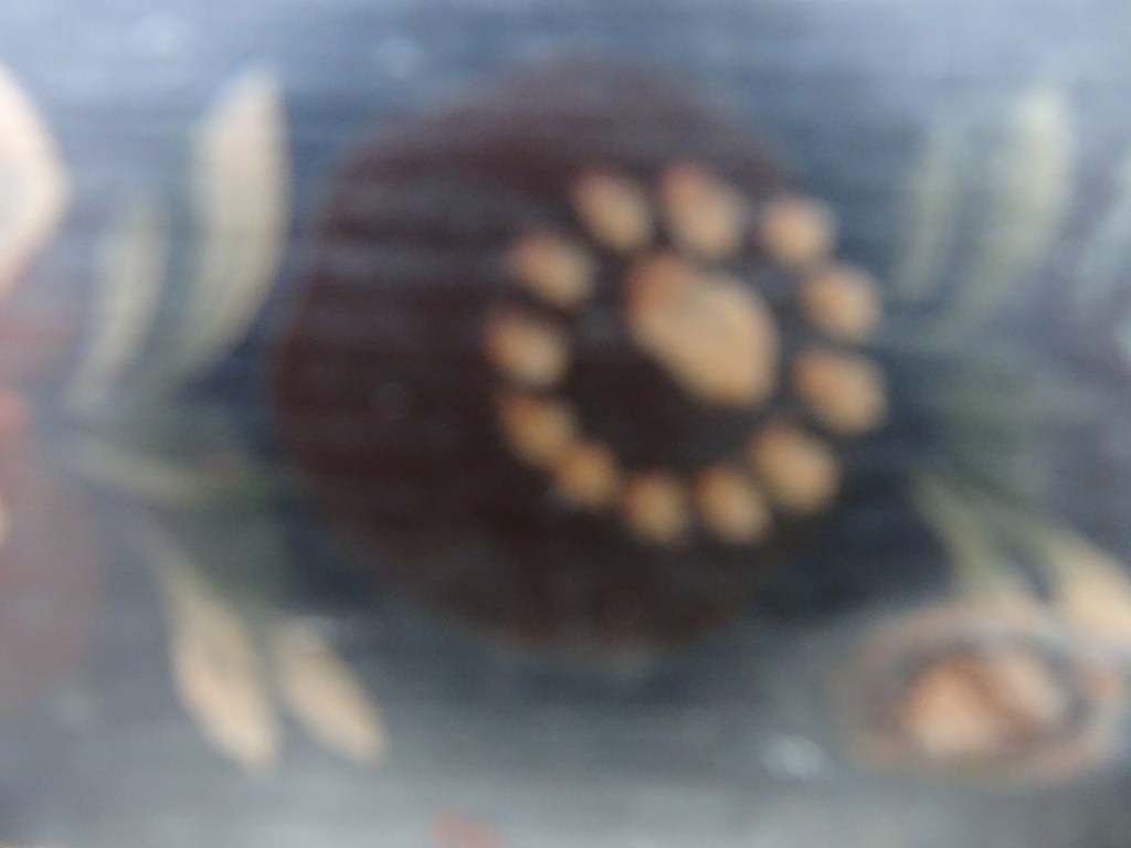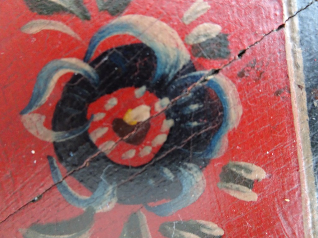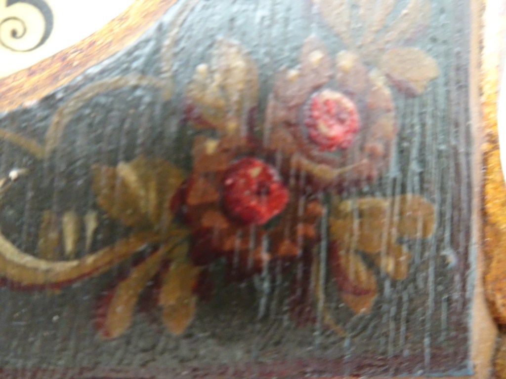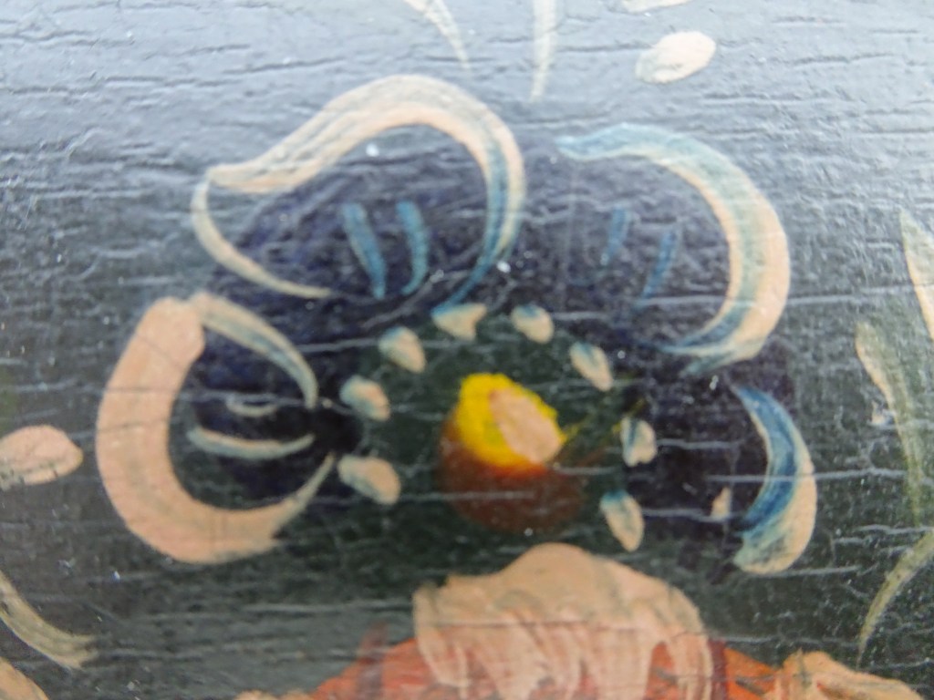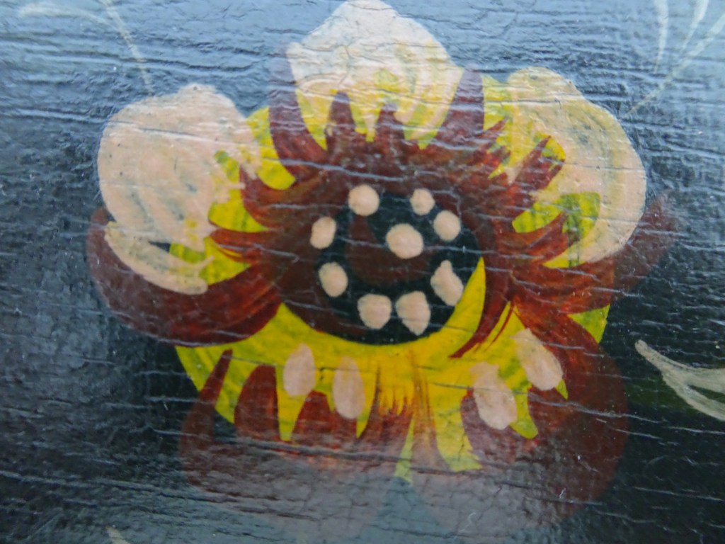 It is a dark blue table. The top plate leans against the wall and shows the red side of the back. There is a sunflower at the end of the scroll, but it was not drawn after that. Birds expelled from paradise find their whereabouts, but look behind them. There is the biblical representation of Genesis 37: verse 28. One flower is drawn on the bulge of the leg called onion.