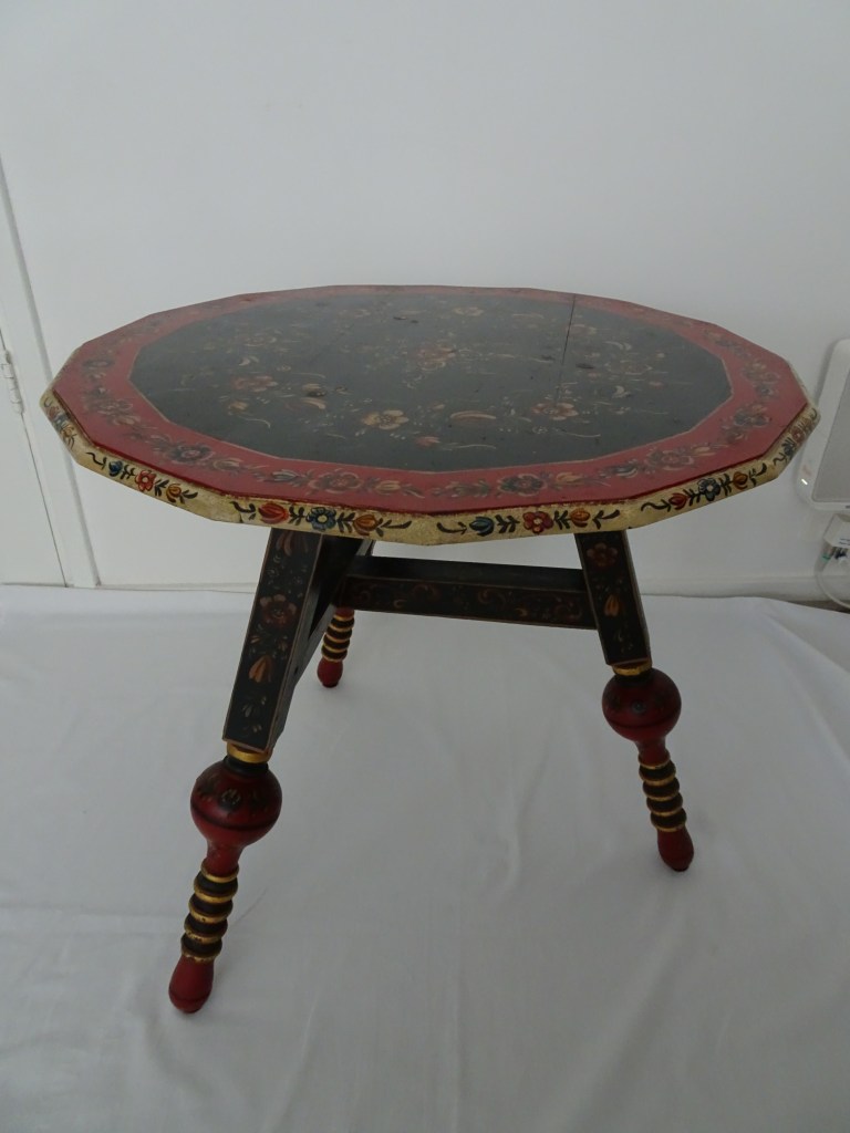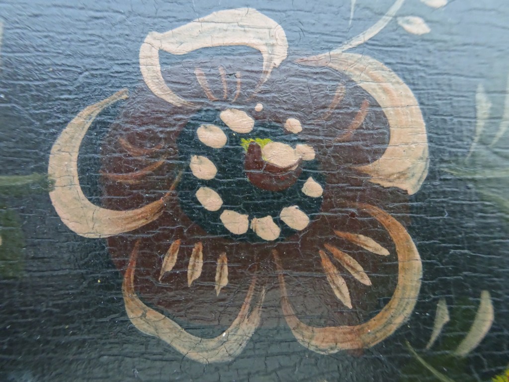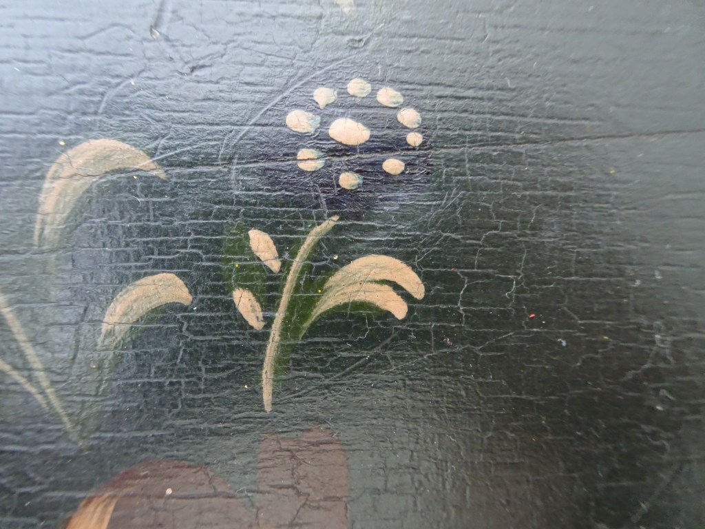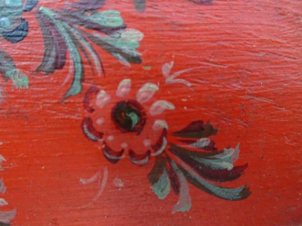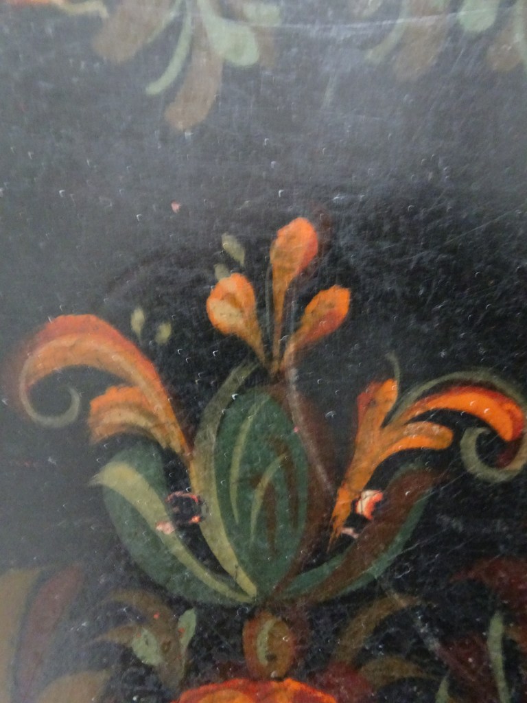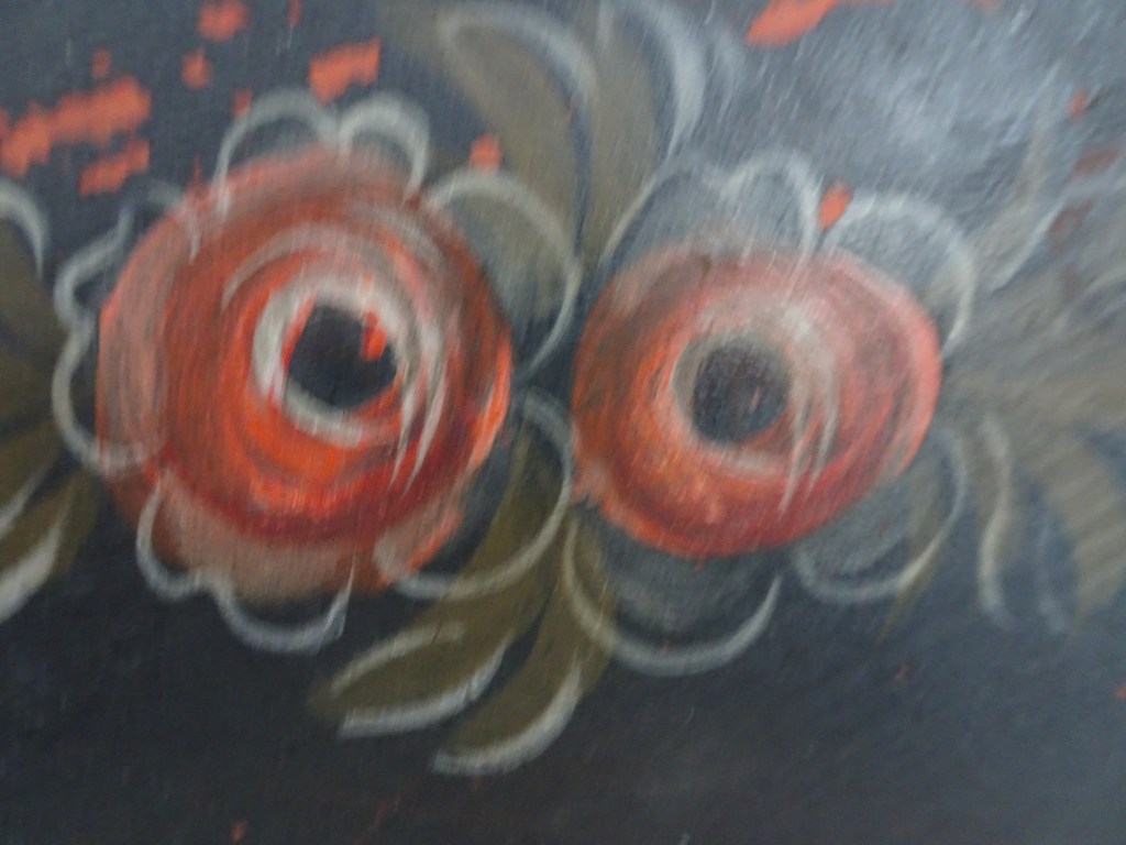 It is a dark blue table. The top plate leans against the wall and shows the red side of the back. There is a sunflower at the end of the scroll, but it was not drawn after that. Birds expelled from paradise find their whereabouts, but look behind them. There is the biblical representation of Genesis 37: verse 28. One flower is drawn on the bulge of the leg called onion.
