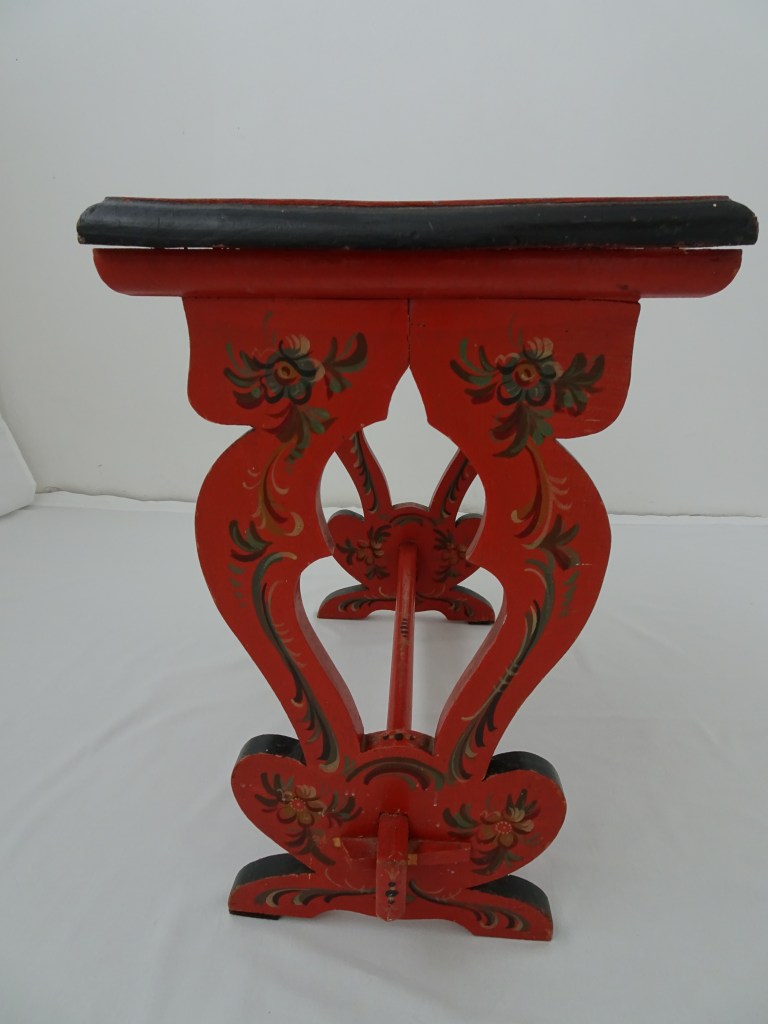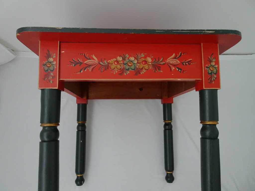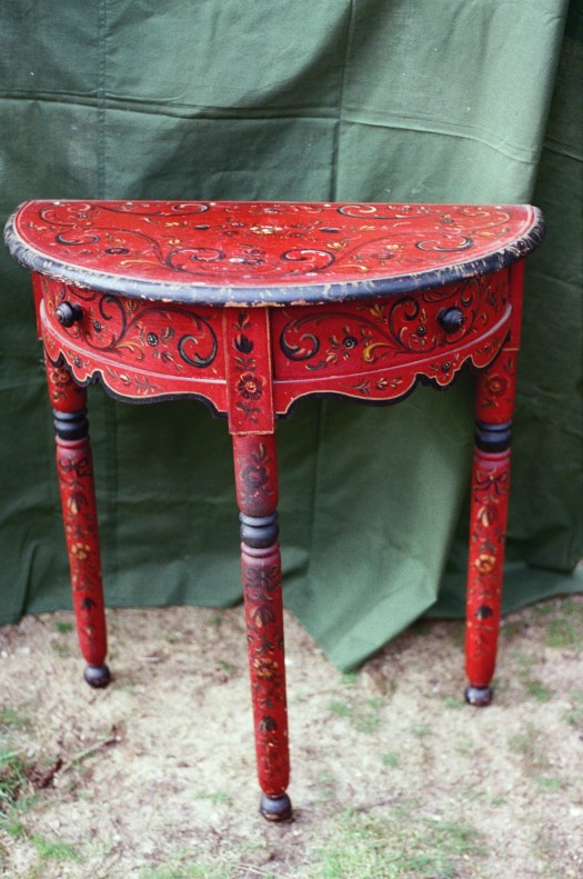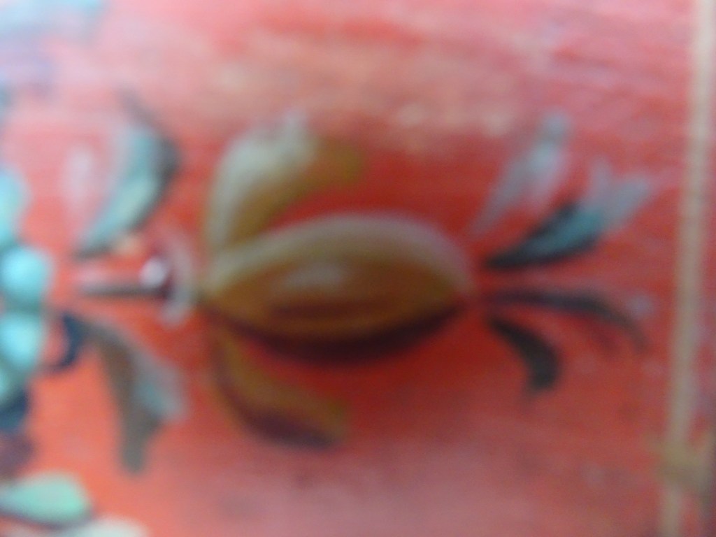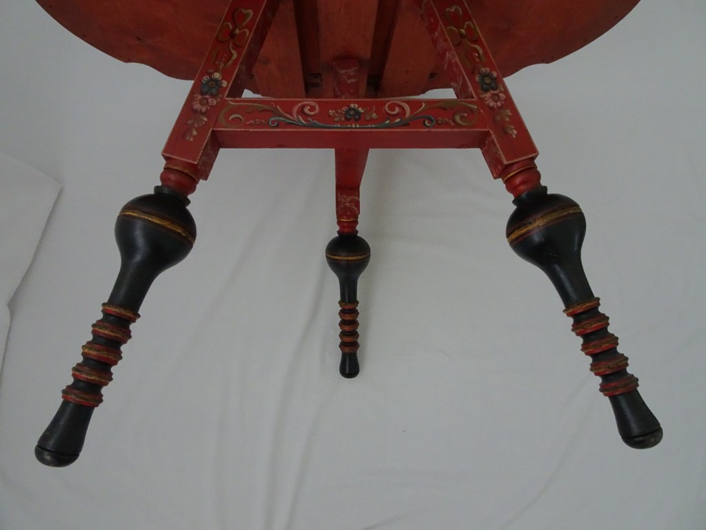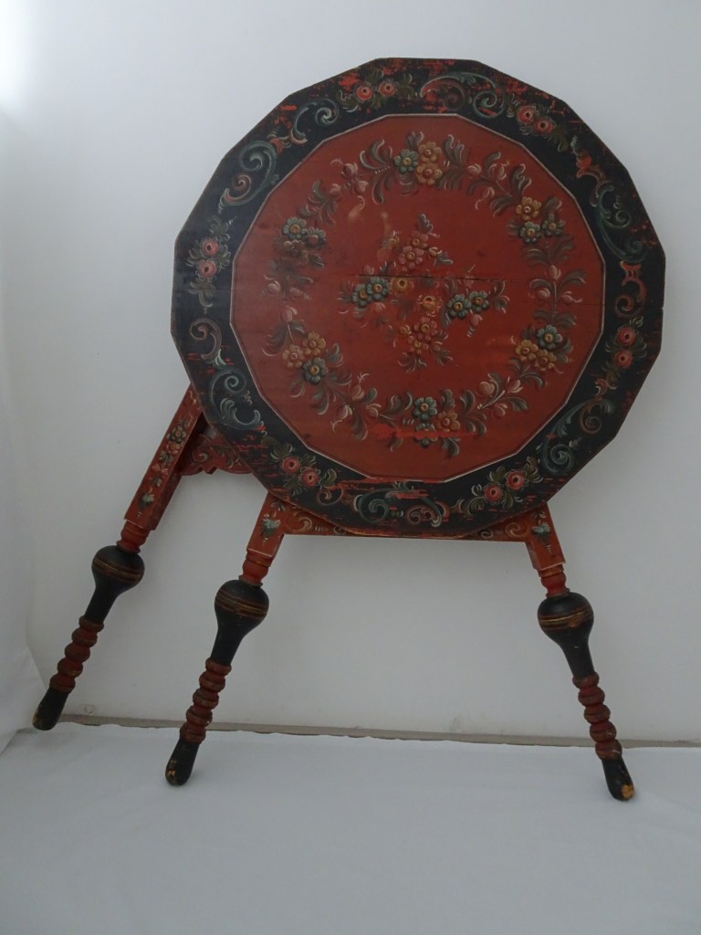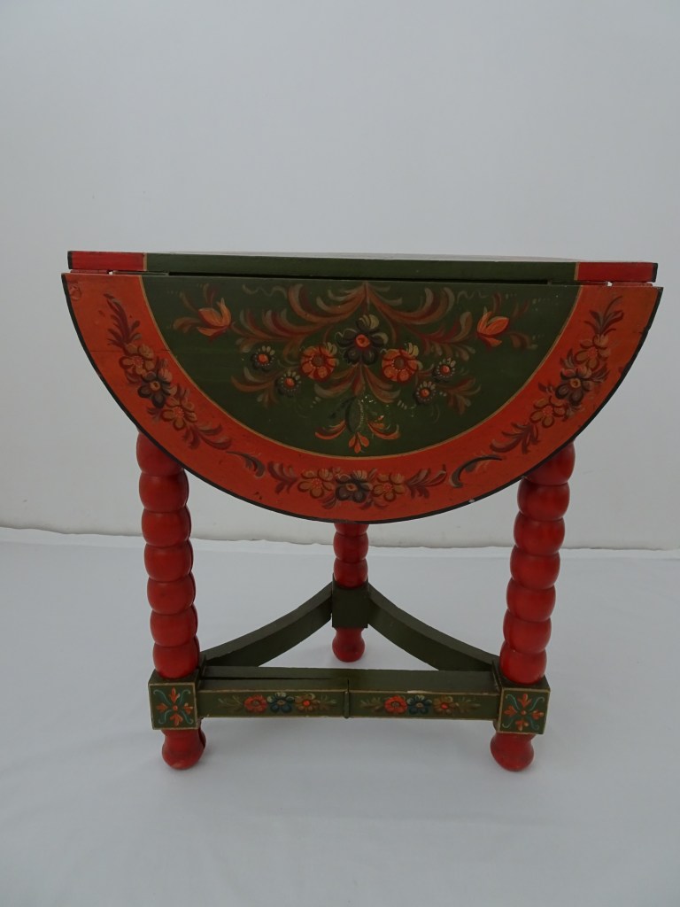 It is a dark blue table. The top plate leans against the wall and shows the red side of the back. There is a sunflower at the end of the scroll, but it was not drawn after that. Birds expelled from paradise find their whereabouts, but look behind them. There is the biblical representation of Genesis 37: verse 28. One flower is drawn on the bulge of the leg called onion.