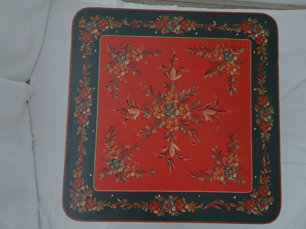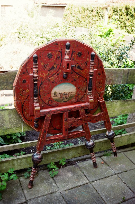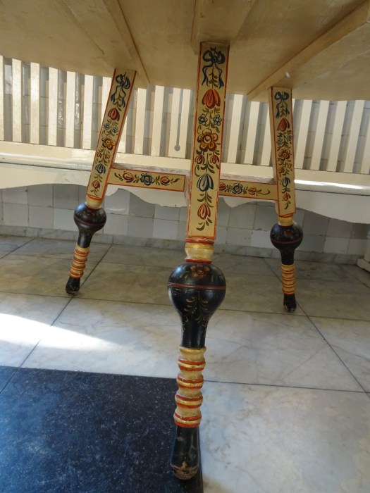 ダークブルーのテーブルです。使わない時は、裏側の赤い面を見せ壁に立て掛けます。スクロールの先にひまわりありますが、その後は描かれませんでした。パラダイスから追い出された鳥は、居場所を見つけましたが後ろを顧みてます。聖書、創世記37-28の話が描かれています。玉ねぎと呼ばれている脚の膨らみに一輪の花が描かれています。