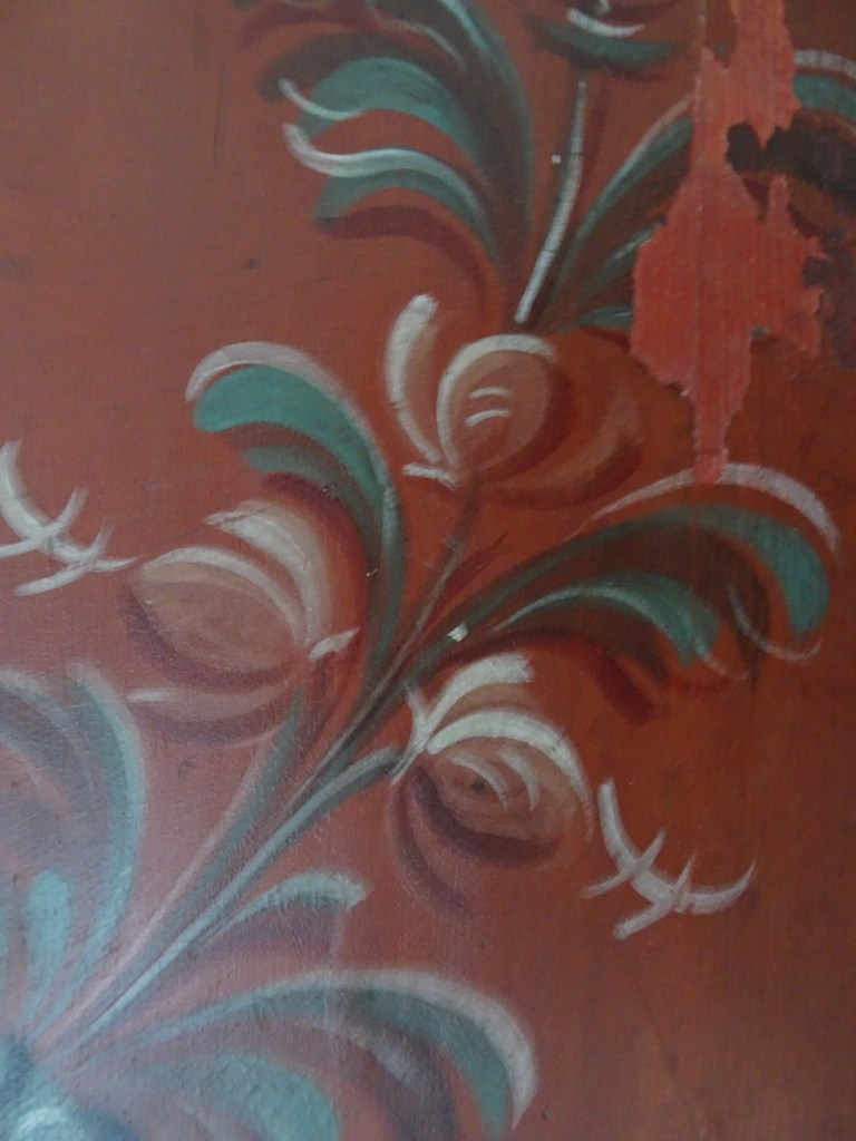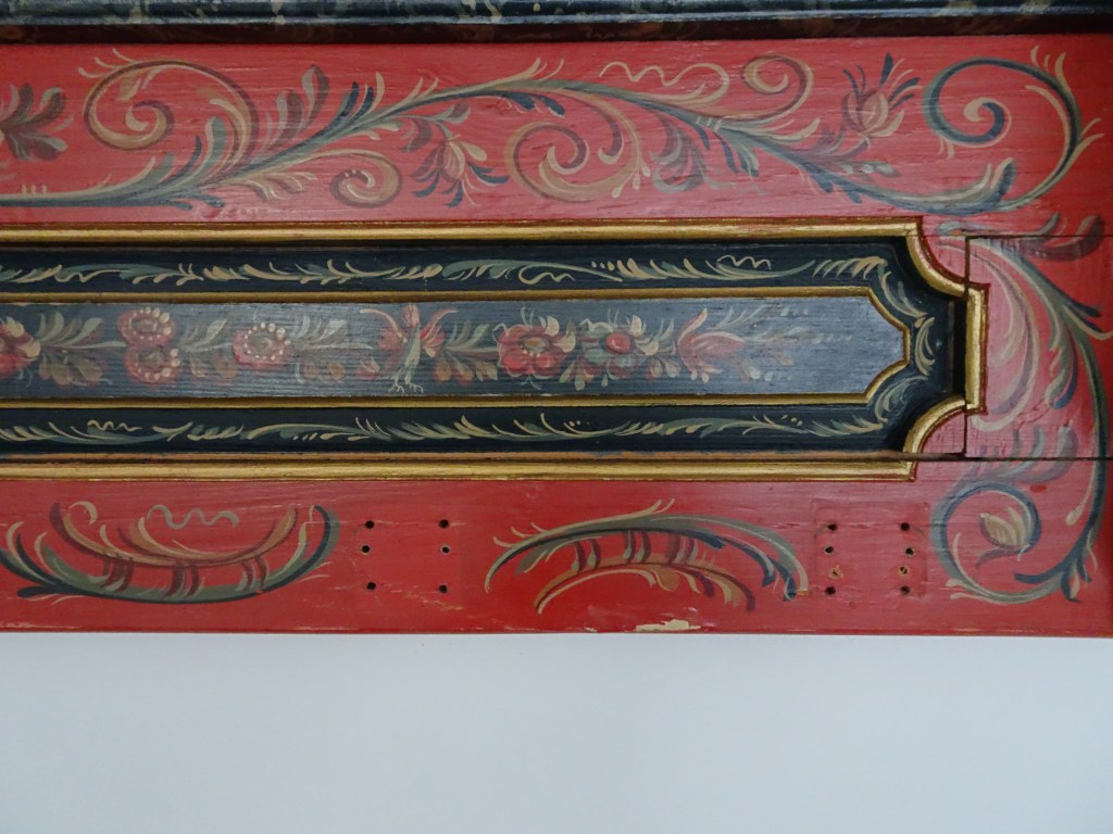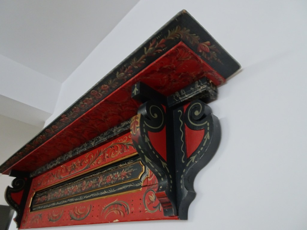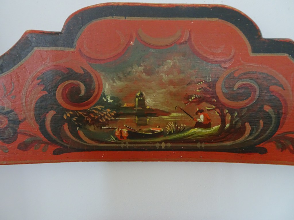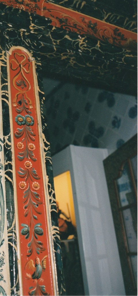 Huttinga had zijn baas al min of meer gedwongen een klus aan te nemen voor een houten paneel in de gang met Hindeloopen stijl bij het museum. Zijn baas, H. Amsterdam vond Fl. 90, - veel te weinig voor het werk, maar Huttinga drong erop aan het zo mooi mogelijk uit te voeren. En het moest binnen een week af. Je kunt een deel van de muurschildering zien. Huttinga had more or less forced his boss to take on a job in front of a wooden panel in the hall with Hindeloopen style at the museum. His boss, H. Amsterdam found Fl. 90, - far too little for the job, but Huttinga insisted that it be as beautiful as possible. And it had to be finished within a week. You can see part of the wall painting. You can see some part of the mural. フッティンガは、彼の上司であるアムステルダム氏に多少強制するかのように、博物館の壁にヒンデローペンスタイルの絵を描く仕事を請け負うよう頼みました。アムステルダム氏はその仕事が90ギルダーでは安すぎると思いました。が、フッティンガはできるだけきれいに仕上げるばかりか、わずか1週間で仕上げました。壁画の一部が見られます。 赫廷塔(Huttinga)要求他的老板阿姆斯特丹(Amsterdam)承担在博物馆墙上画一幅Hindelopen风格的图片的任务,好像在强迫他一点。阿姆斯特丹认为这份工作对于90荷兰盾来说太便宜了。但是Futtinga不仅尽可能干净地完成了工作,而且仅用了一周的时间。您可以看到壁画的一部分。