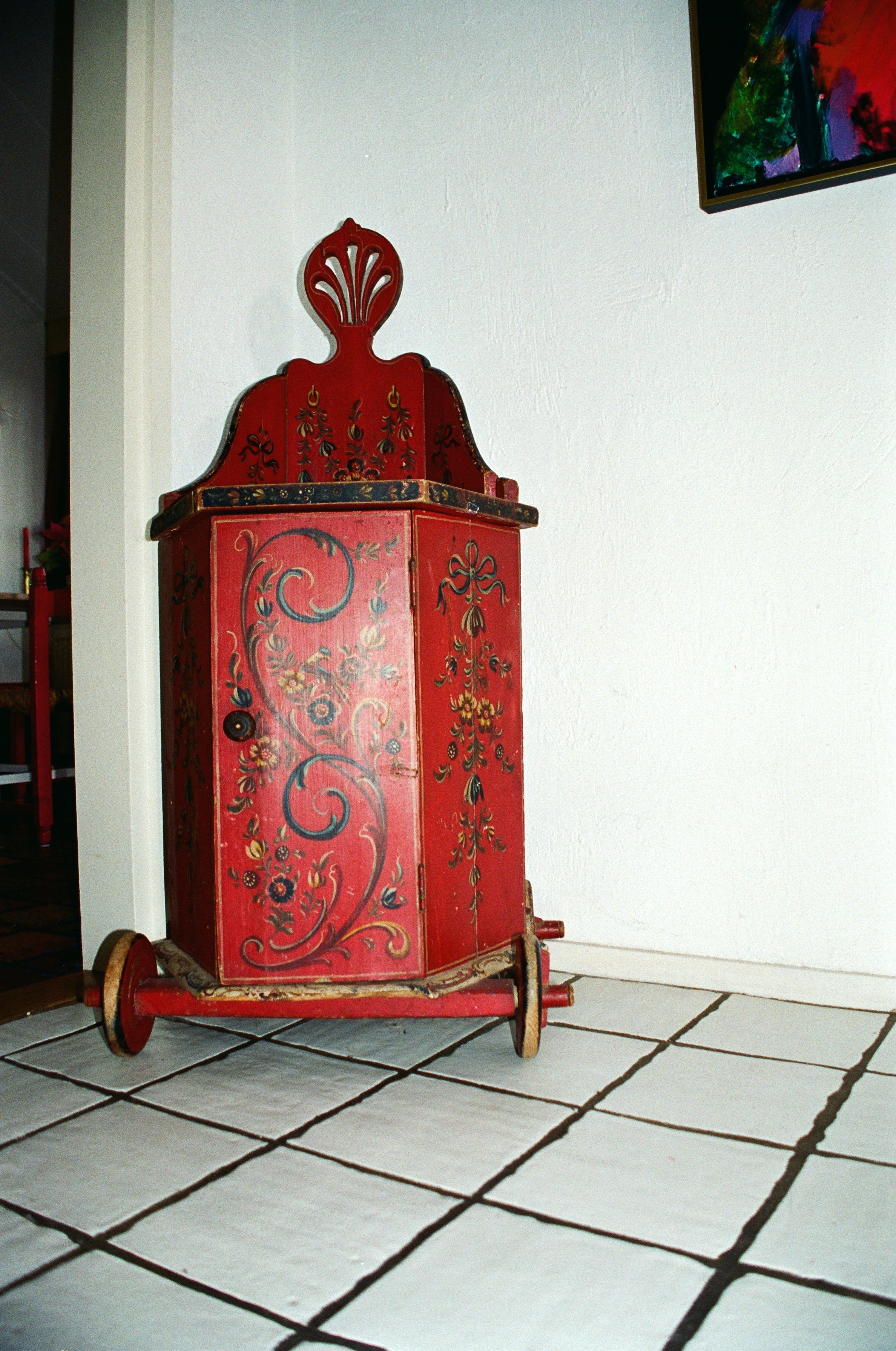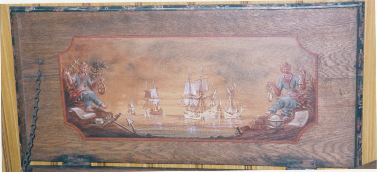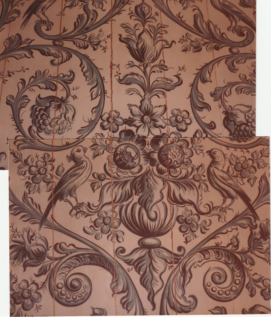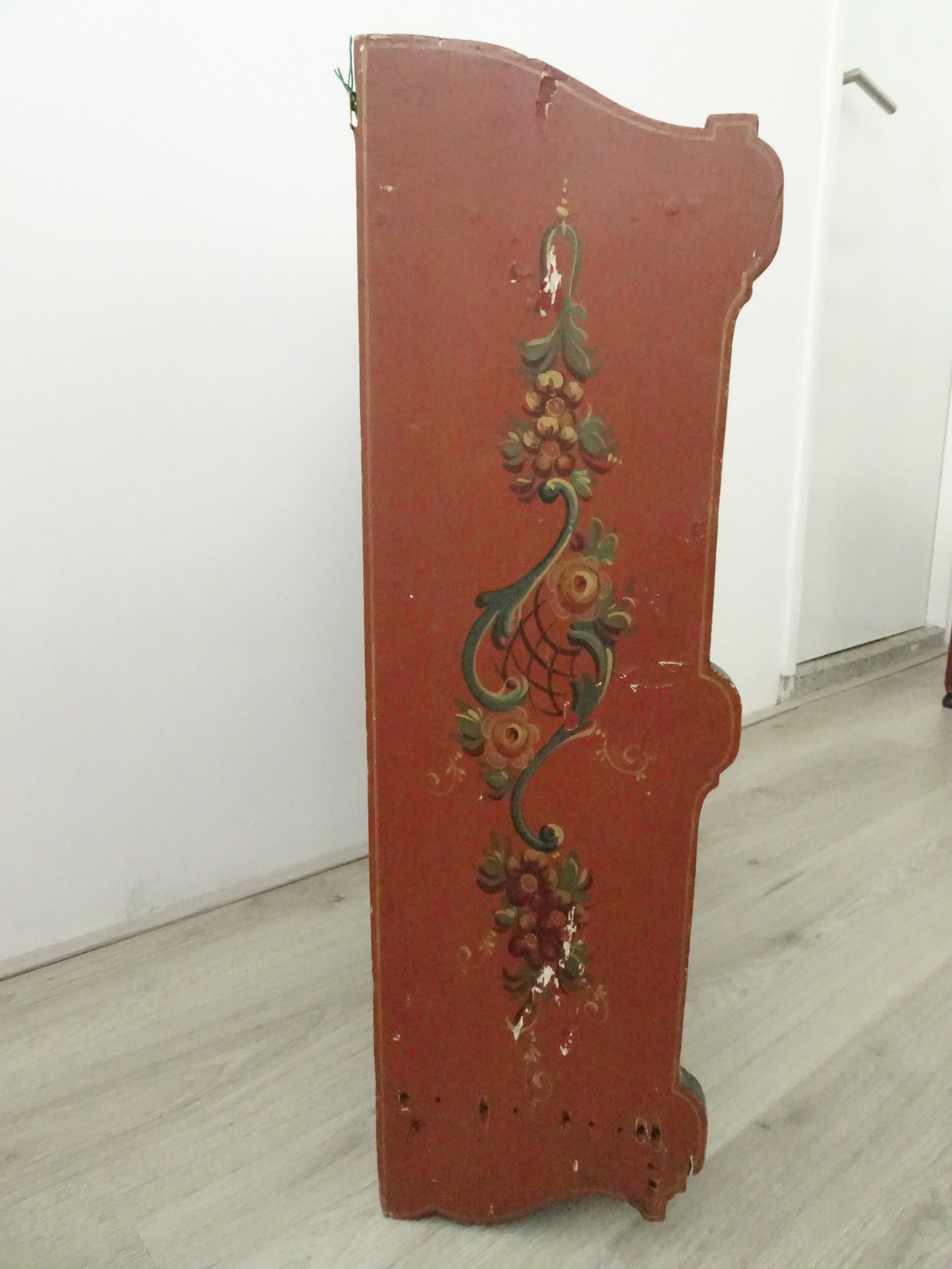 Huttinga had zijn baas al min of meer gedwongen een klus aan te nemen voor een houten paneel in de gang met Hindeloopen stijl bij het museum. Zijn baas, H. Amsterdam vond Fl. 90, - veel te weinig voor het werk, maar Huttinga drong erop aan het zo mooi mogelijk uit te voeren. En het moest binnen een week af. Je kunt een deel van de muurschildering zien. Huttinga had more or less forced his boss to take on a job in front of a wooden panel in the hall with Hindeloopen style at the museum. His boss, H. Amsterdam found Fl. 90, - far too little for the job, but Huttinga insisted that it be as beautiful as possible. And it had to be finished within a week. You can see part of the wall painting. You can see some part of the mural. フッティンガは、彼の上司であるアムステルダム氏に多少強制するかのように、博物館の壁にヒンデローペンスタイルの絵を描く仕事を請け負うよう頼みました。アムステルダム氏はその仕事が90ギルダーでは安すぎると思いました。が、フッティンガはできるだけきれいに仕上げるばかりか、わずか1週間で仕上げました。壁画の一部が見られます。 赫廷塔(Huttinga)要求他的老板阿姆斯特丹(Amsterdam)承担在博物馆墙上画一幅Hindelopen风格的图片的任务,好像在强迫他一点。阿姆斯特丹认为这份工作对于90荷兰盾来说太便宜了。但是Futtinga不仅尽可能干净地完成了工作,而且仅用了一周的时间。您可以看到壁画的一部分。