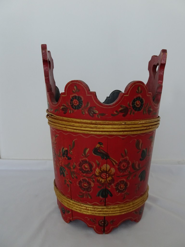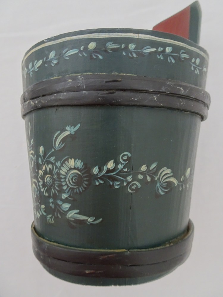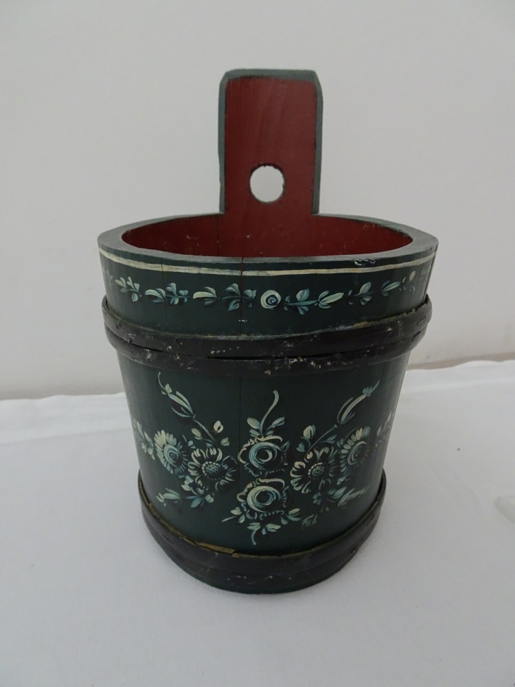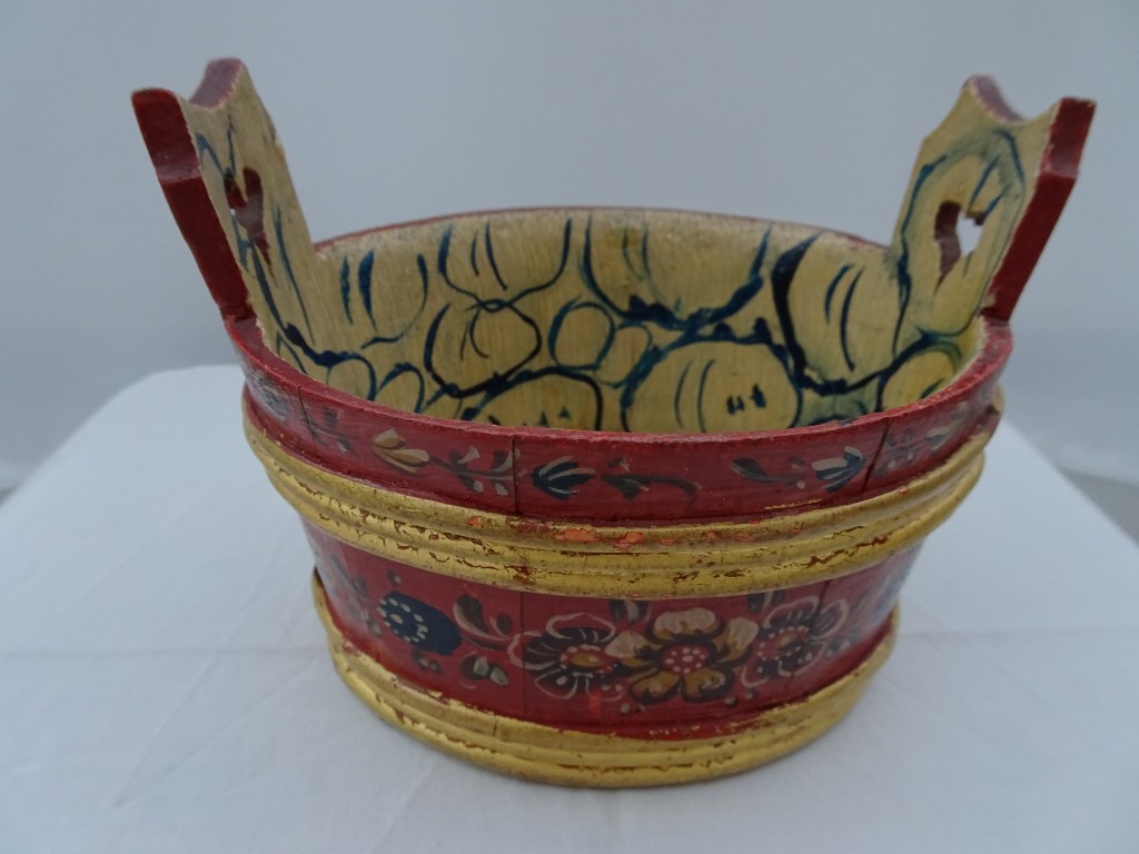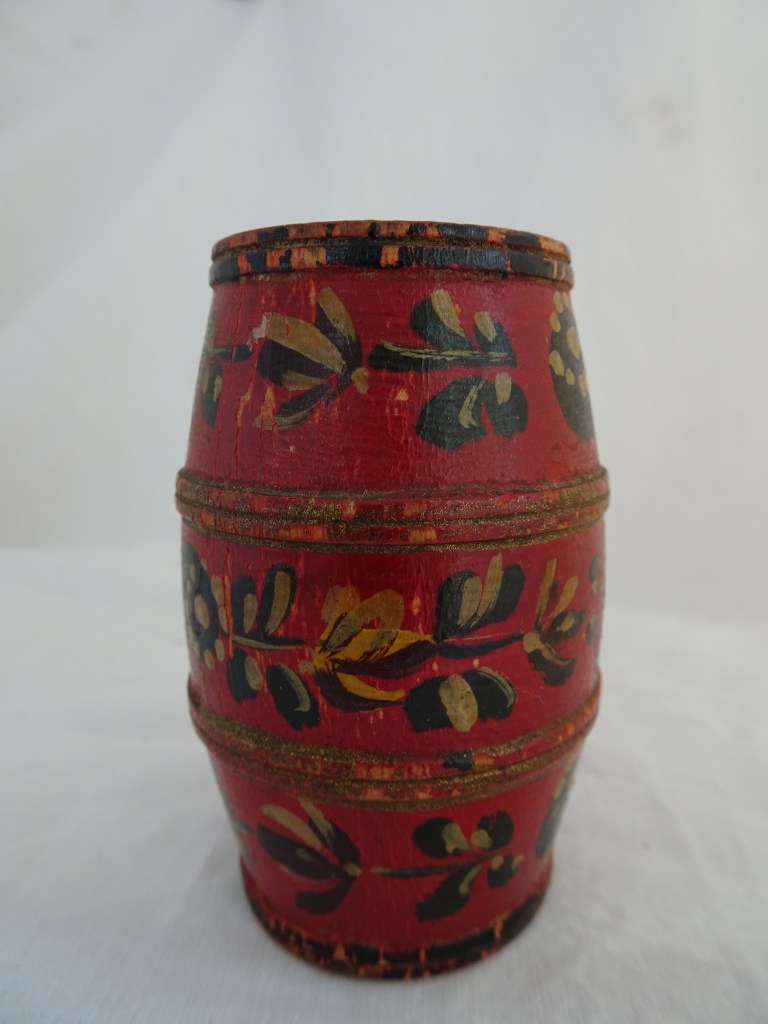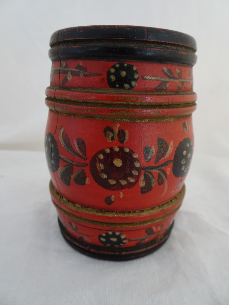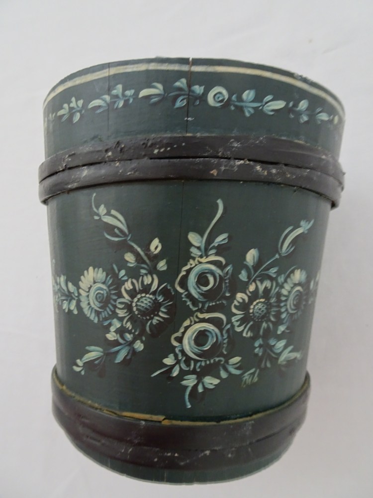 Tobbertje Tub 桶 桶 (浴缸) 19x13cm. H 13cm. By Ypma Tobbetjes zijn in de 18e eeuw veelvuldig in Hindeloopen beschilderd. Om tobbetjes heen zitten wilgentenen om ze goed bij elkaar houden. Het deksel heeft een speciaal model, voorzien van een gemarmerd motief op een donkerblauwe ondergrond. Tubs were frequently painted in Hindeloopen in the 18th century, Tubs have straps, which made of the branches of willows, to hold the tub well together. The lid has a special model with marbled design on a dark blue background. 桶は18世紀にヒンデローペンで頻繁にペイントされました。桶をまとめるたがは柳の枝でできています。蓋の取っ手は独特の形で大理石模様が施されています。 浴盆經常在18世紀在欣德洛彭(Hindeloopen)塗漆,浴缸有由柳樹枝條製成的帶子,可以很好地將浴缸固定在一起。 蓋子有一個特殊的模型與深藍色背景上的大理石設計。