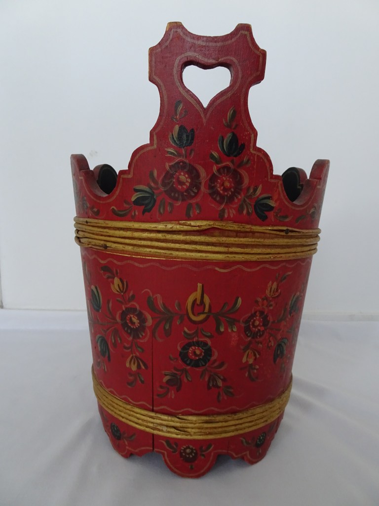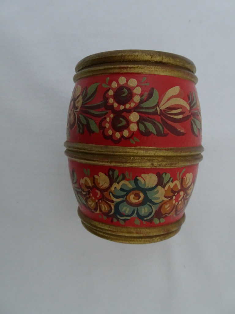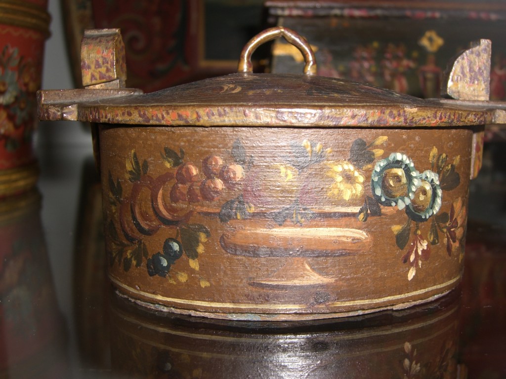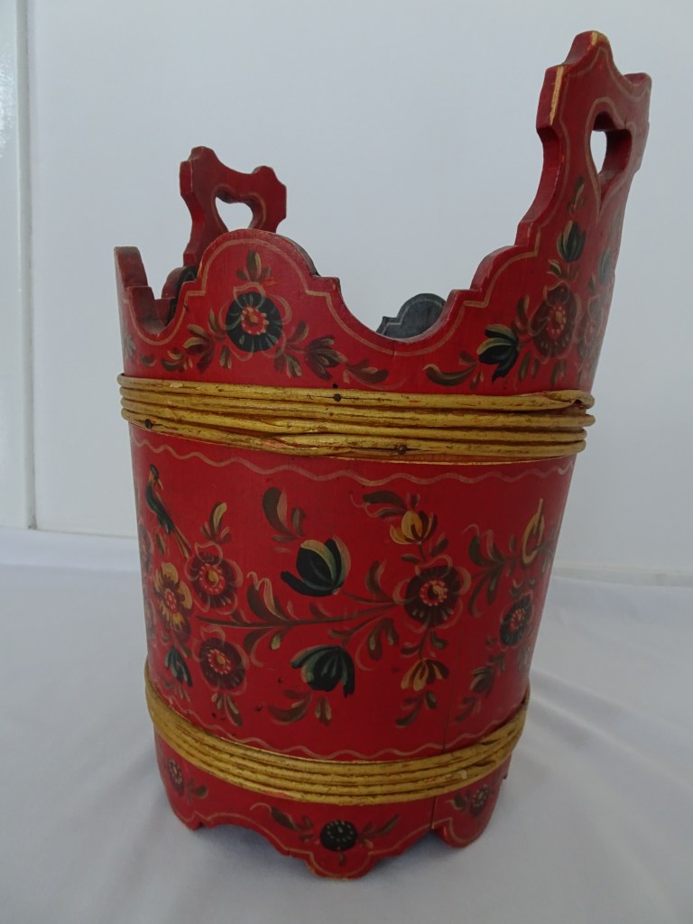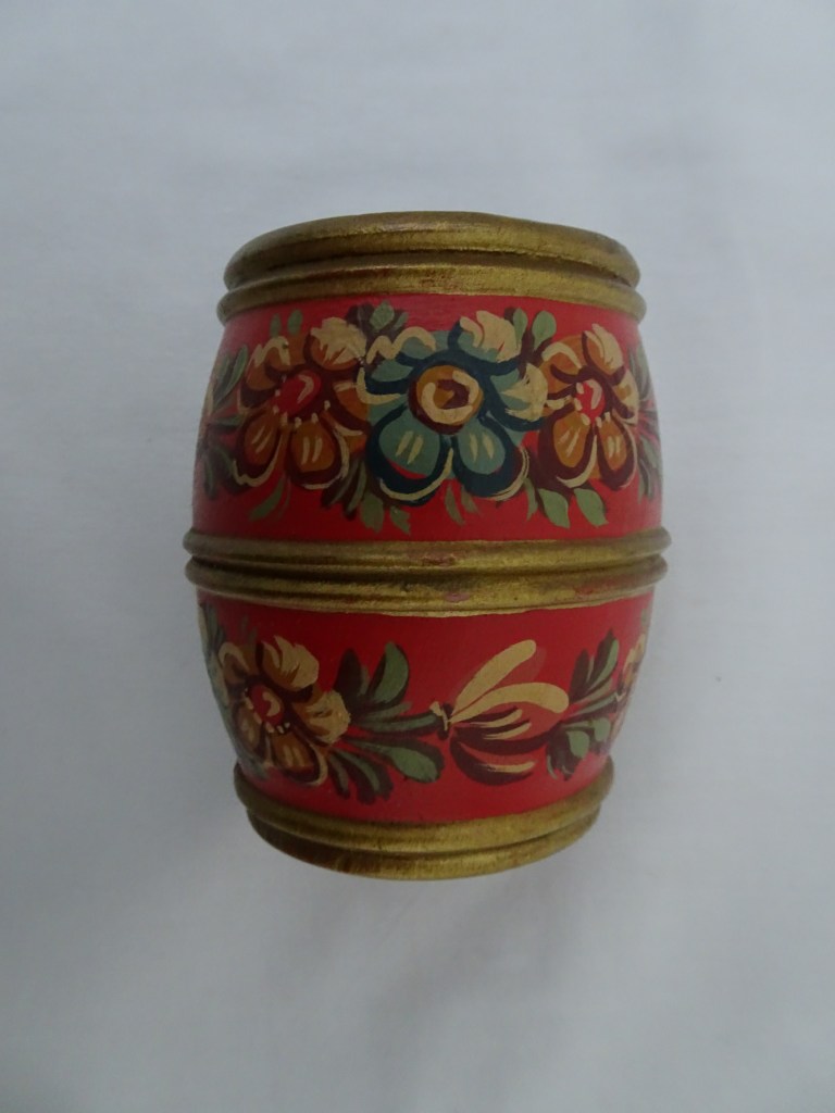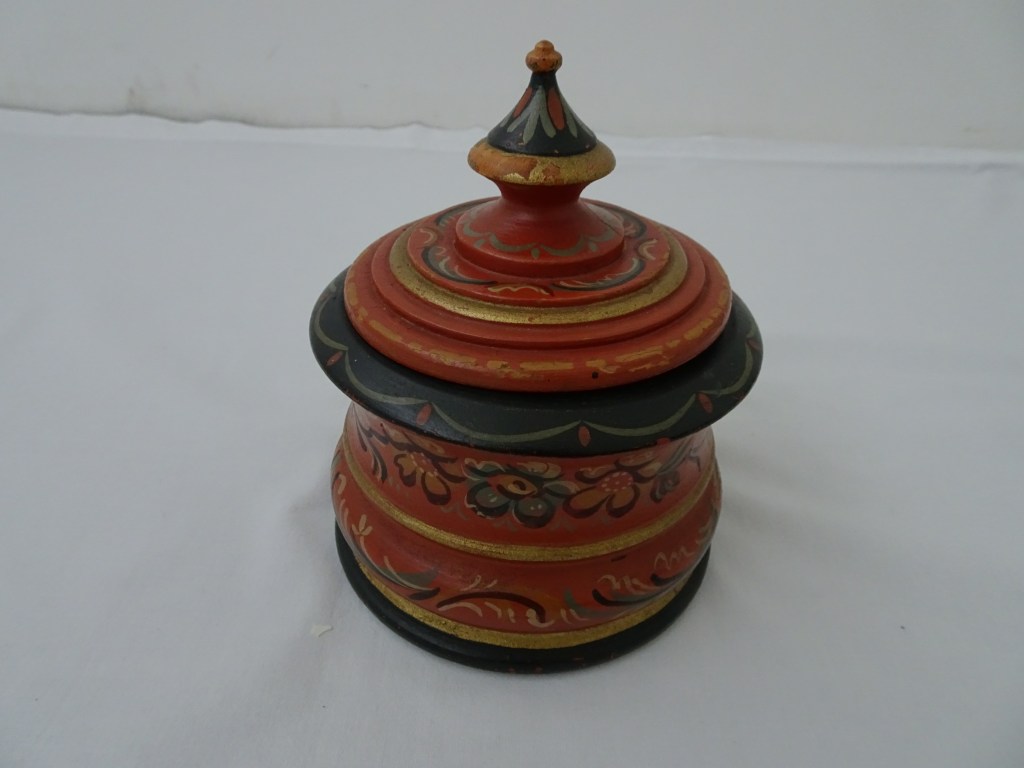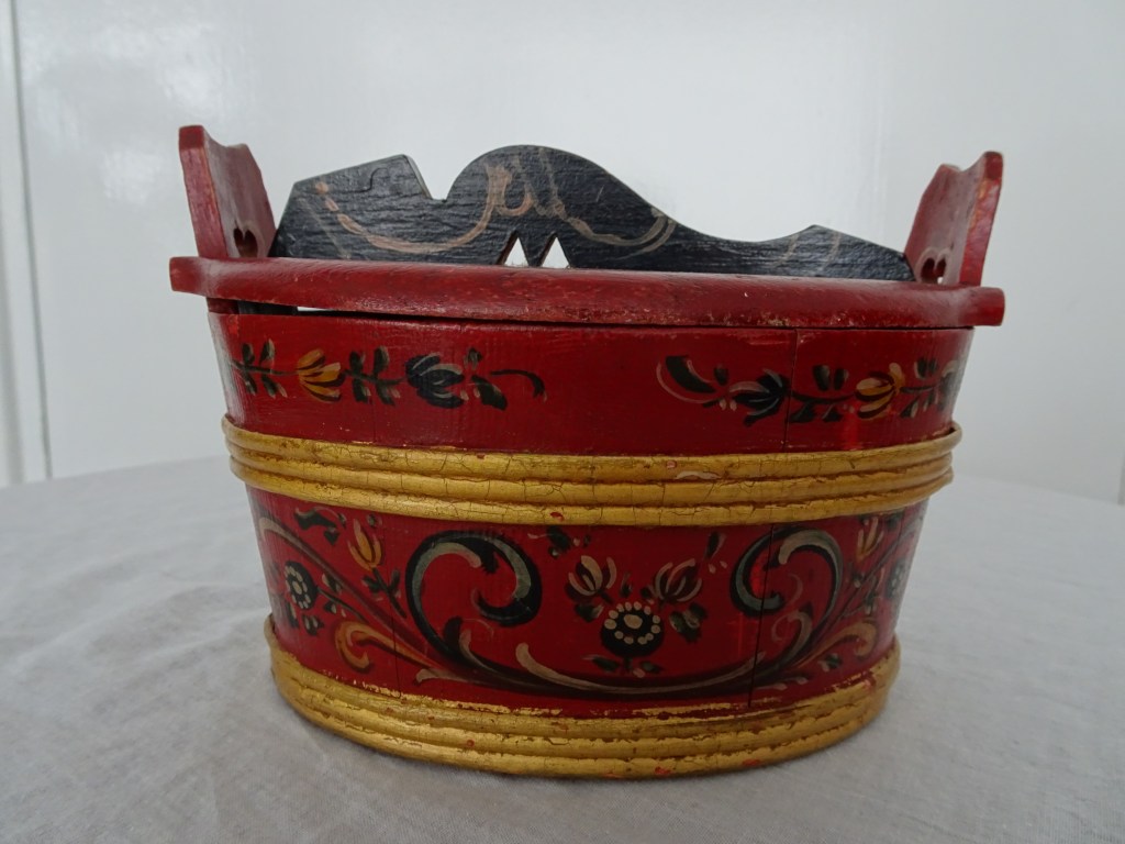 Tobbertje Tub 桶 桶 (浴缸) 19x13cm. H 13cm. By Ypma Tobbetjes zijn in de 18e eeuw veelvuldig in Hindeloopen beschilderd. Om tobbetjes heen zitten wilgentenen om ze goed bij elkaar houden. Het deksel heeft een speciaal model, voorzien van een gemarmerd motief op een donkerblauwe ondergrond. Tubs were frequently painted in Hindeloopen in the 18th century, Tubs have straps, which made of the branches of willows, to hold the tub well together. The lid has a special model with marbled design on a dark blue background. 桶は18世紀にヒンデローペンで頻繁にペイントされました。桶をまとめるたがは柳の枝でできています。蓋の取っ手は独特の形で大理石模様が施されています。 浴盆經常在18世紀在欣德洛彭(Hindeloopen)塗漆,浴缸有由柳樹枝條製成的帶子,可以很好地將浴缸固定在一起。 蓋子有一個特殊的模型與深藍色背景上的大理石設計。