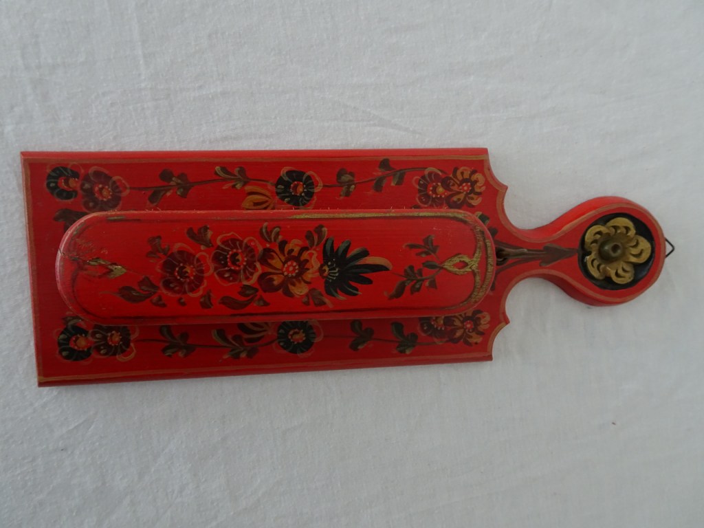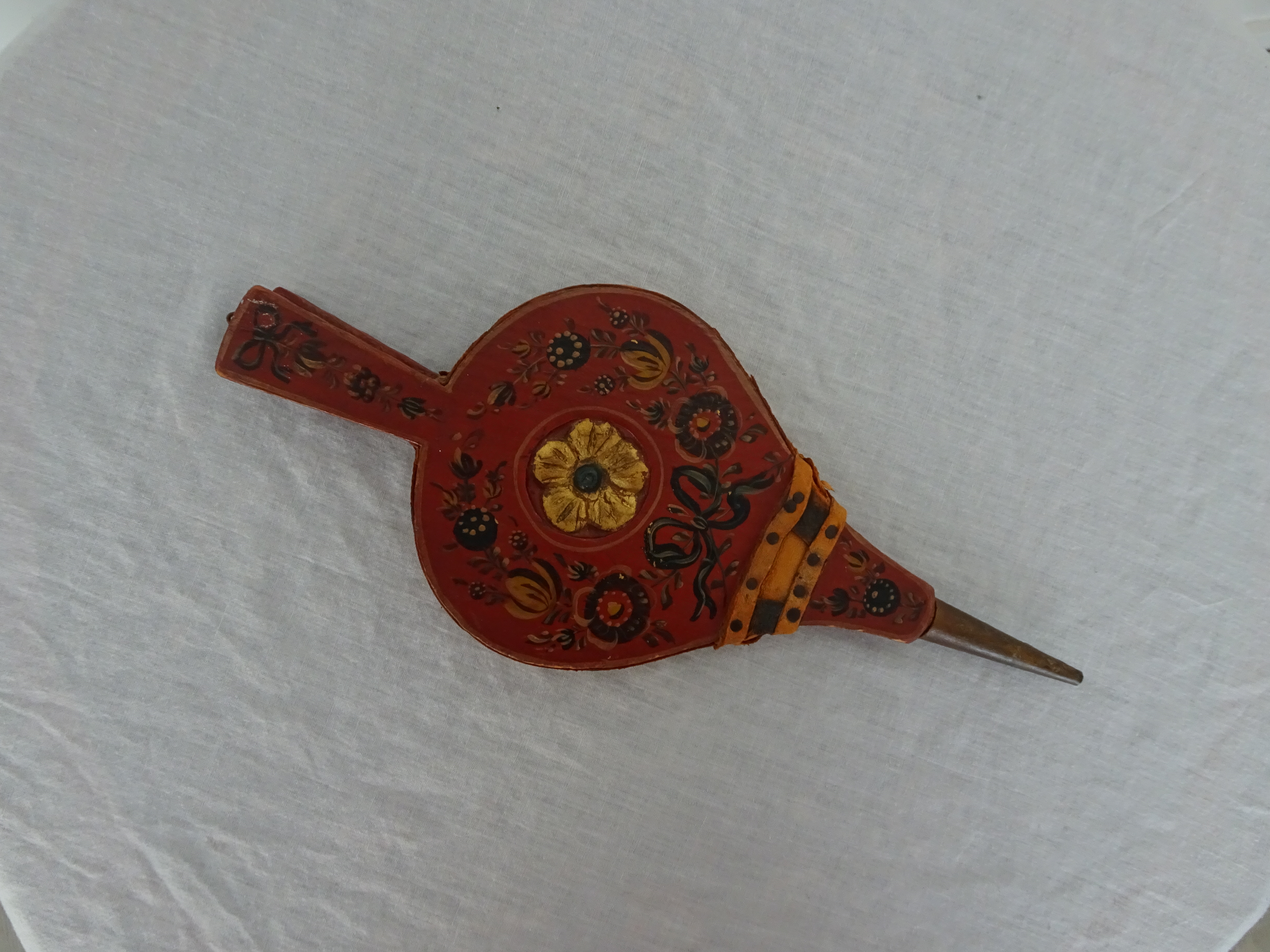 Het heeft een koperen blaaspijpje en in het midden een gesneden bloem. Een mooie strik met takjes eroverheen en ook op de handgrepen zit een strik. De achterkanten zijn op een donkerblauwe/ wit ondergrond gemarmerd.