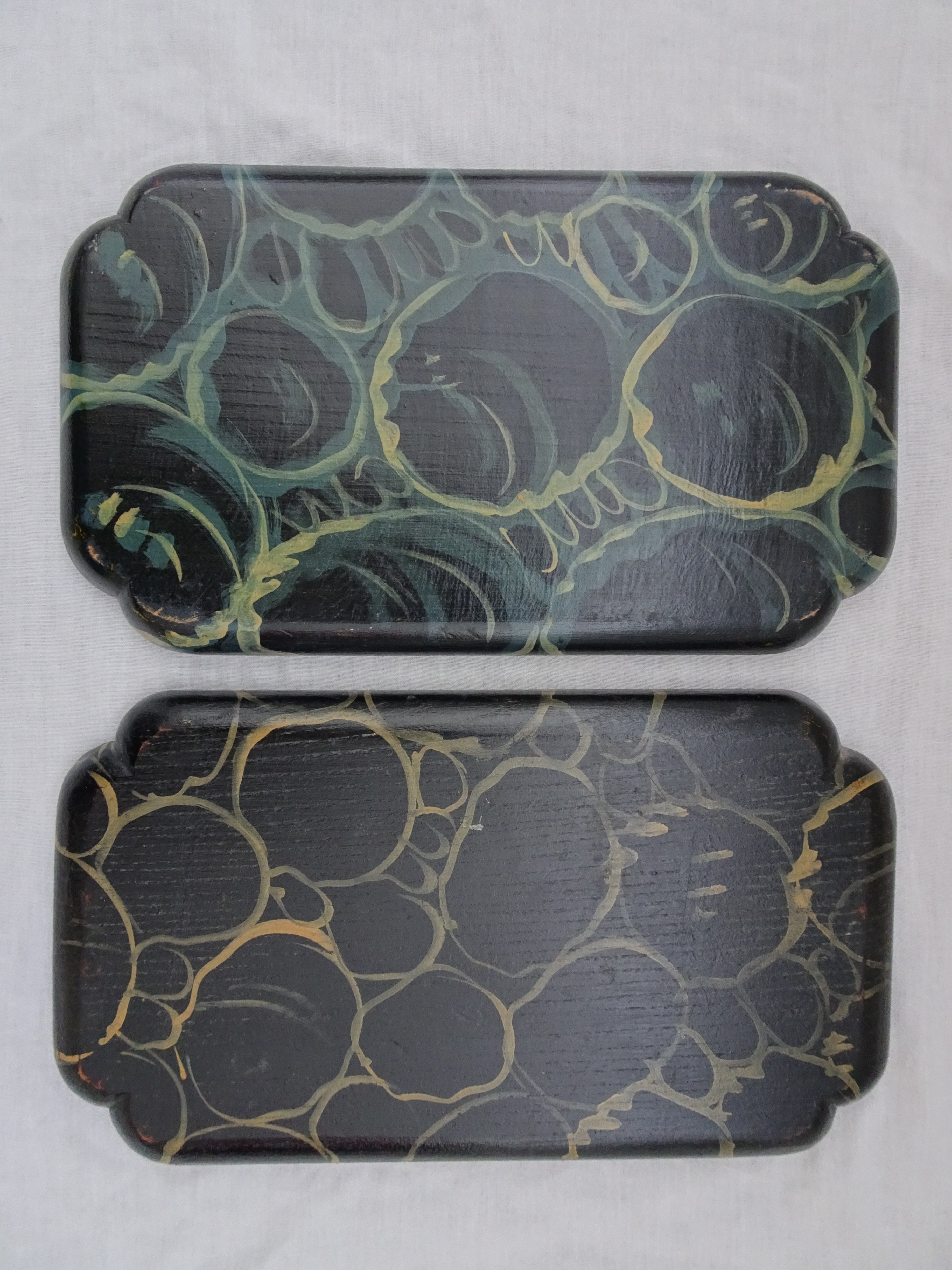 Volgende 3 werken zijn geschilderd met schaduwtechniek op donkergroene grondkleur. The following 3 works are painted with shadow technique on a dark green ground color.次の3作はダークグリーンの地色にシャドーテクニックでペイントされています。以下3幅作品是在深绿色底色上采用阴影技术绘制的