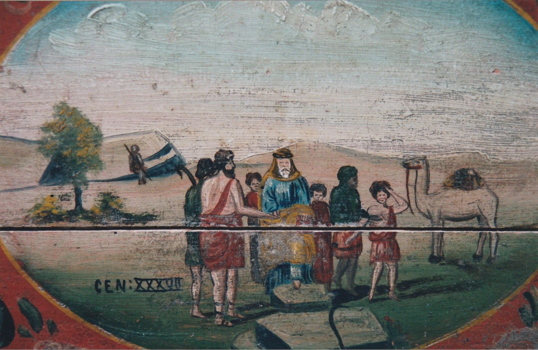 这是一张深蓝色的桌子。不使用时,显示背面的红色侧面并靠在墙上。卷轴末尾有一个向日葵,但之后没有绘制。被驱逐出天堂的鸟儿会发现他们的行踪,但是看看他们身后。绘制了圣经,创世纪37-28的故事。在称为洋葱的腿的凸起上绘制一朵花。