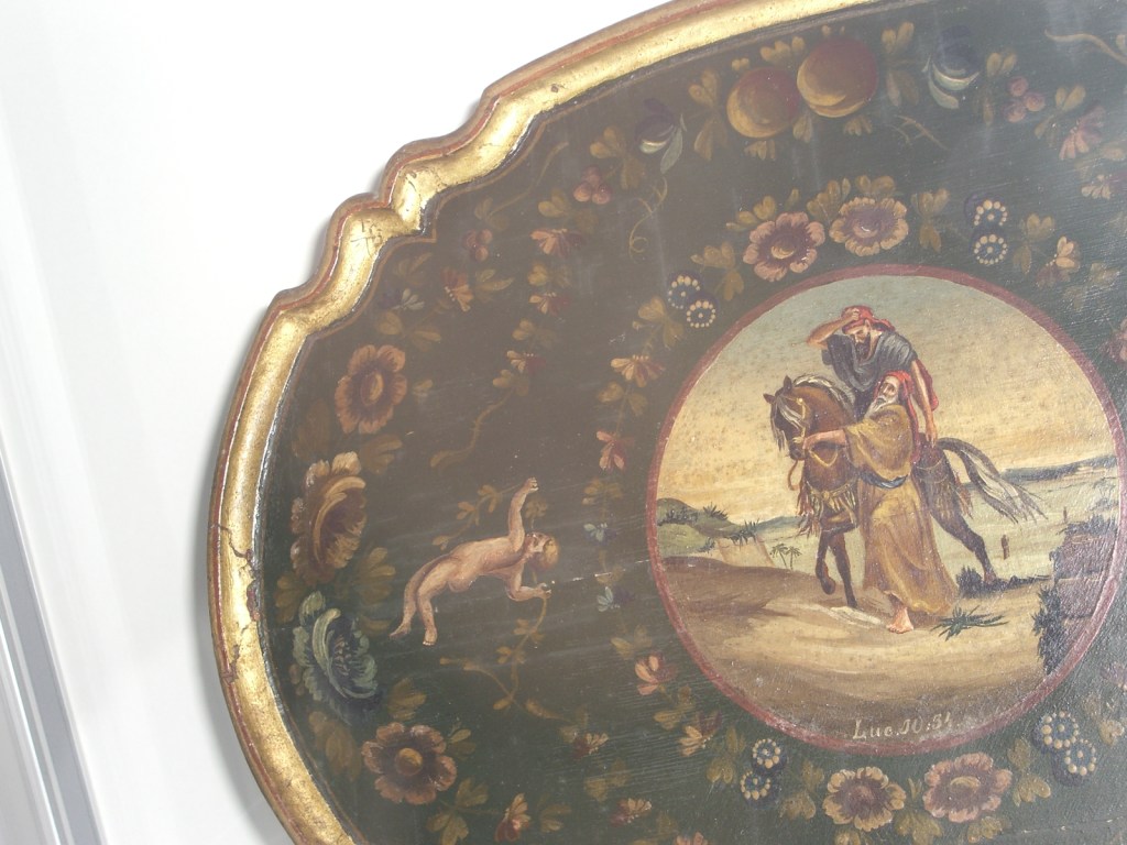 Dienblad Tray 盆 托盘 Luc. Good samaritan ある人がエルサレムからエリコに下って行く途中、強盗どもが彼を襲い、その着物をはぎ取り、傷を負わせ、半殺しにしたまま、逃げ去った。するとたまたま、ひとりの祭司がその道を下ってきたが、この人を見ると、向こう側を通って行った。同様に、レビ人もこの場所にさしかかってきたが、彼を見ると向こう側を通って行った。ところが、あるサマリヤ人が旅をしてこの人のところを通りかかり、彼を見て気の毒に思い、近寄ってきてその傷にオリブ油とぶどう酒とを注いでほうたいをしてやり、自分の家畜に乗せ、宿屋に連れて行って介抱した。翌日、宿屋の主人に支払い『この人を見てやってください。費用がよけいにかかったら、帰りがけに、わたしが支払います』と言った。