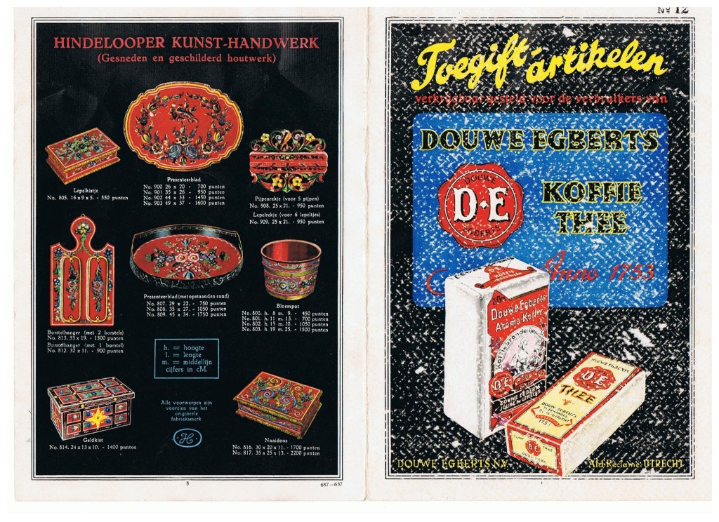 Dienblad Try 盆 盘 44.5x 34cm & 26.5x19.5cm Logo DE+Catalog number By Kooy Tijdens de oorlog was een koffie fabriek, Douwe Egberts, van plan om kortingsbonnen voor waren te ruilen met het werk van Hindeloopen. De werken van Hindeloopen zijn verspreid naar het huis. Achter het werk staan het logo van de fabrikant en het catalogusnummer. During the war, a coffee maker, Douwe Egberts, planned to exchange coupons for merchandise with Hindeloopen’s works. Hindeloopen's works have spread to the home. Behind the work is the manufacturer's logo and catalog number. 戦争中、コーヒーメーカーのDouwe Egbertsの企画で、商品についているクーポン券を集めるとヒンダローペンの作品と交換できました。家庭にヒンダローペンの作品が普及しました。作品の裏にはメーカーのロゴとカタログ番号があります。 在战争期间,咖啡厂Douwe Egberts计划与Hindeloopen的作品交换商品优惠券。 Hindeloopen的作品已传播到家中。工作背后是制造商的徽标和目录号。