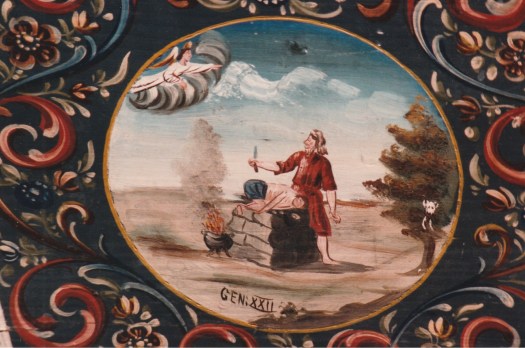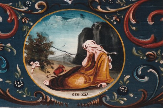 这是一张深蓝色的桌子。不使用时,显示背面的红色侧面并靠在墙上。卷轴末尾有一个向日葵,但之后没有绘制。被驱逐出天堂的鸟儿会发现他们的行踪,但是看看他们身后。绘制了圣经,创世纪37-28的故事。在称为洋葱的腿的凸起上绘制一朵花。