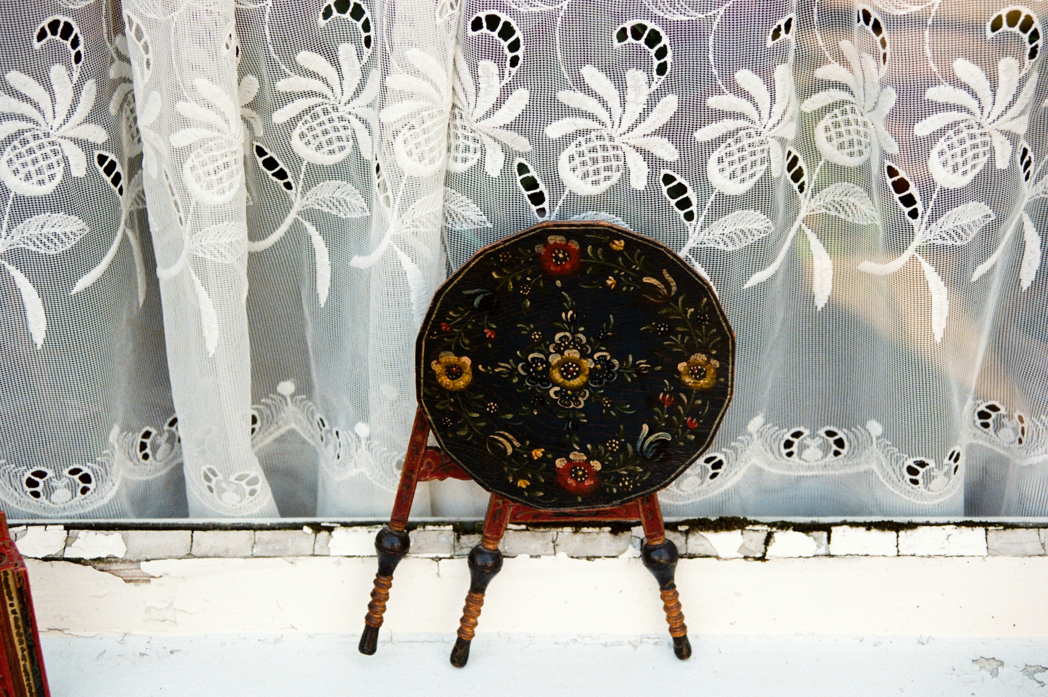 It is a dark blue table. The top plate leans against the wall and shows the red side of the back. There is a sunflower at the end of the scroll, but it was not drawn after that. Birds expelled from paradise find their whereabouts, but look behind them. There is the biblical representation of Genesis 37: verse 28. One flower is drawn on the bulge of the leg called onion.