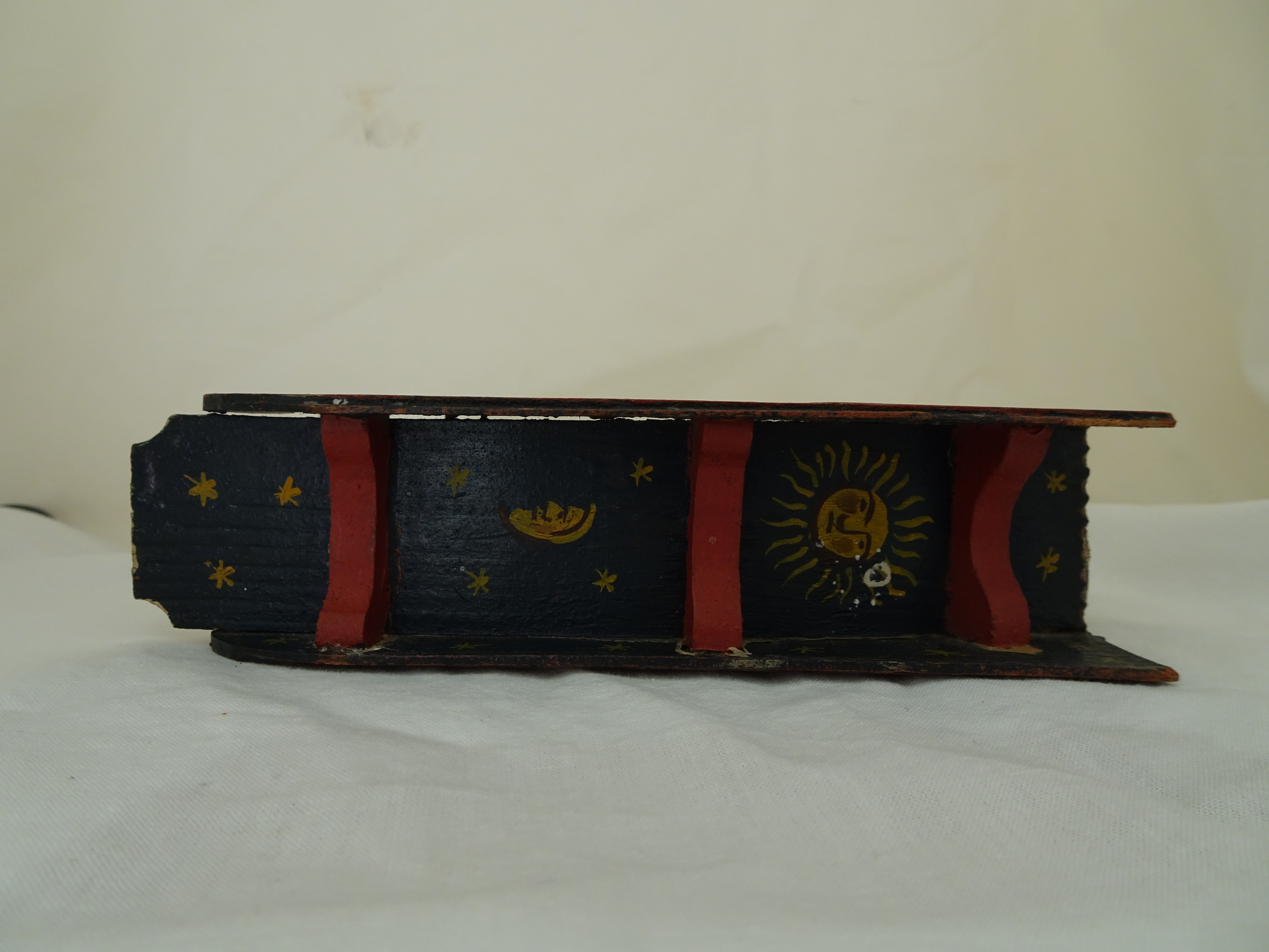 Later painted by Feike Kooy. The sun, moon and stars are drawn to the bottom of the sled because it was stored from the ceiling and not used.
