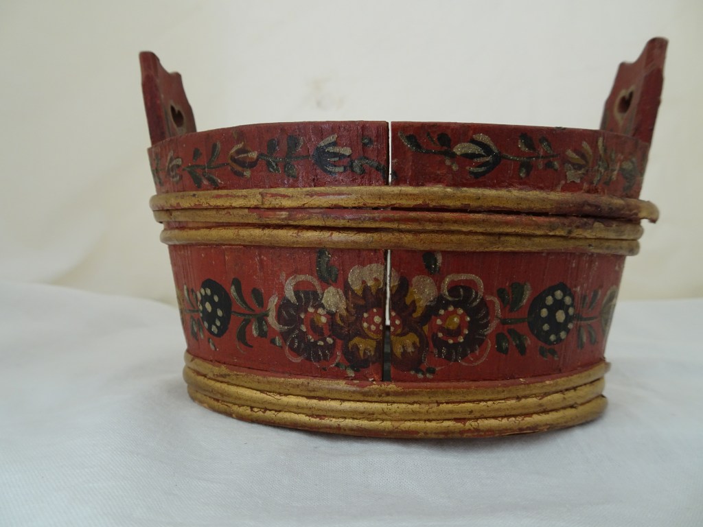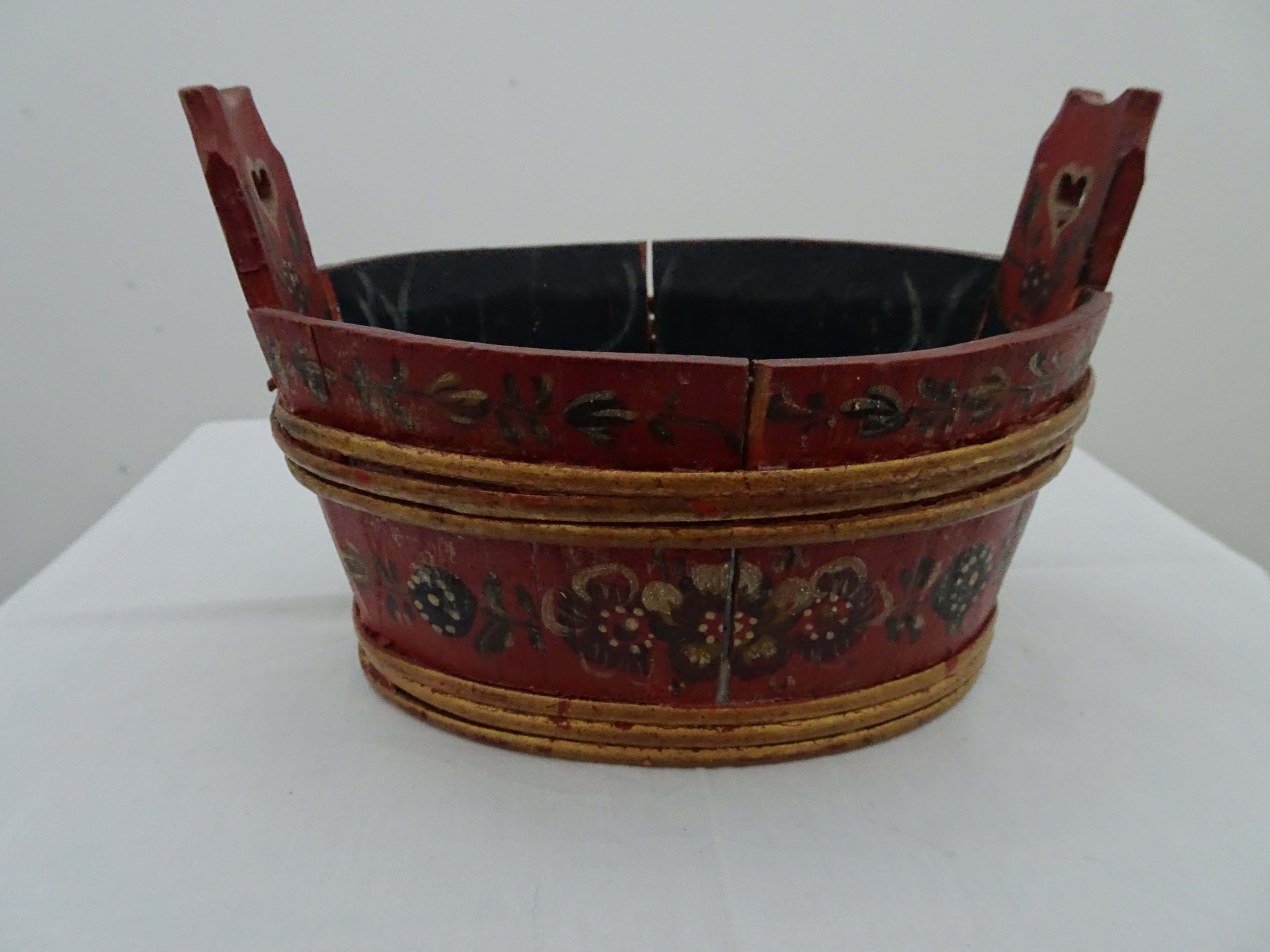 Tobbertje Tub 桶 桶 (浴缸) 19x13cm. H 13cm. By Ypma Tobbetjes zijn in de 18e eeuw veelvuldig in Hindeloopen beschilderd. Om tobbetjes heen zitten wilgentenen om ze goed bij elkaar houden. Het deksel heeft een speciaal model, voorzien van een gemarmerd motief op een donkerblauwe ondergrond. Tubs were frequently painted in Hindeloopen in the 18th century, Tubs have straps, which made of the branches of willows, to hold the tub well together. The lid has a special model with marbled design on a dark blue background. 桶は18世紀にヒンデローペンで頻繁にペイントされました。桶をまとめるたがは柳の枝でできています。蓋の取っ手は独特の形で大理石模様が施されています。 浴盆經常在18世紀在欣德洛彭(Hindeloopen)塗漆,浴缸有由柳樹枝條製成的帶子,可以很好地將浴缸固定在一起。 蓋子有一個特殊的模型與深藍色背景上的大理石設計。